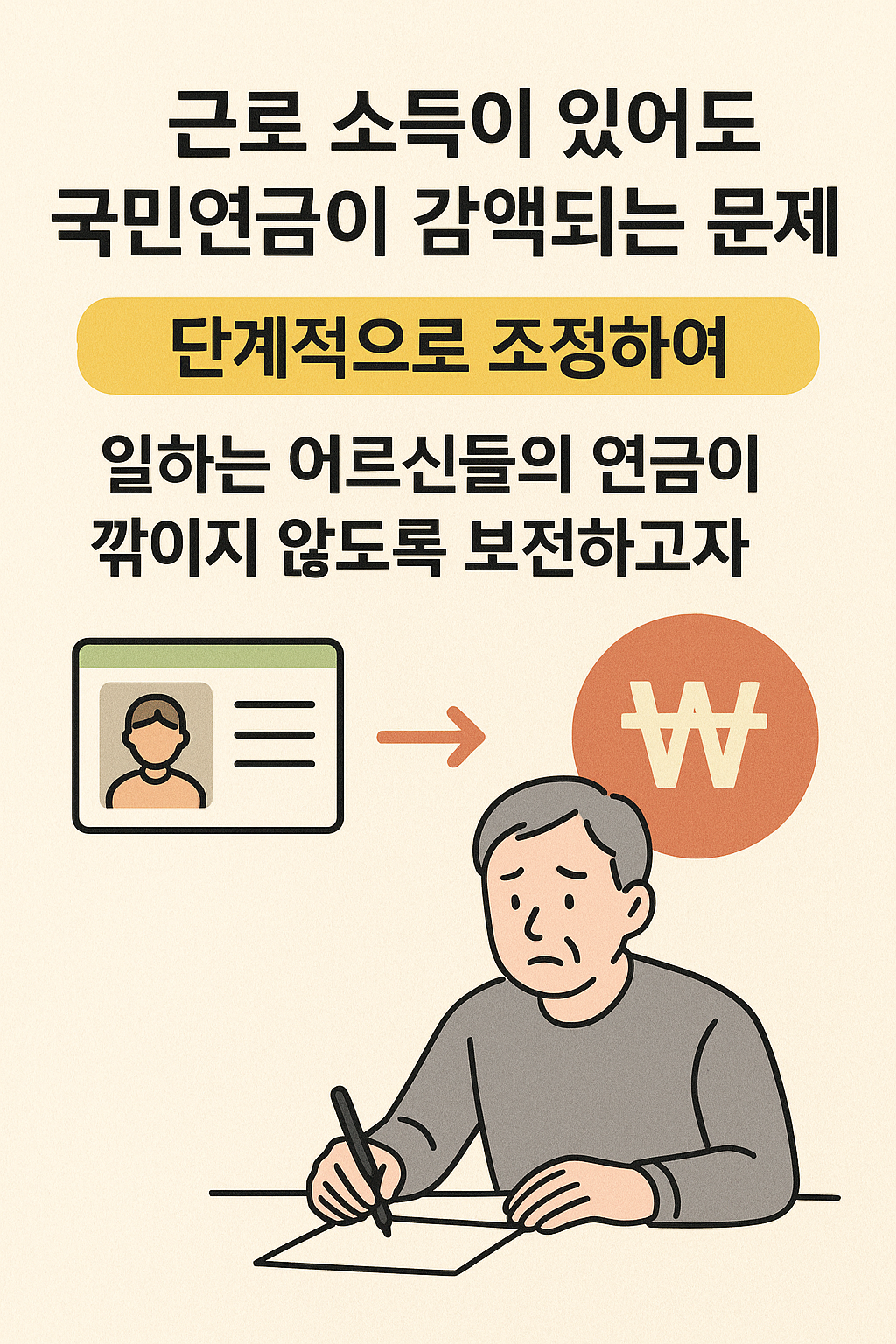 어르신들이 일을 해서 돈을 벌면, 지금은 국민연금이 줄어드는 경우가 있어요.