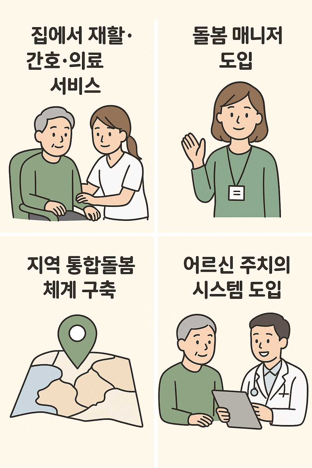 “몸이 불편한 어르신들도 집에서 안전하고 편하게 치료와 돌봄을 받을 수 있도록 나라가 챙기겠다”는 뜻이에요.