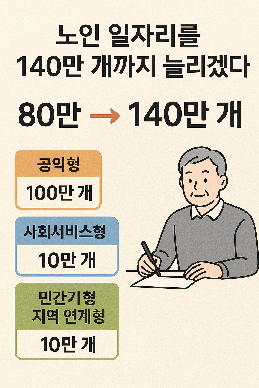 지금은 어르신들이 할 수 있는 일자리가 약 80만 개 정도 있어요. 앞으로는 이걸 140만 개까지 늘리겠다는 거예요.