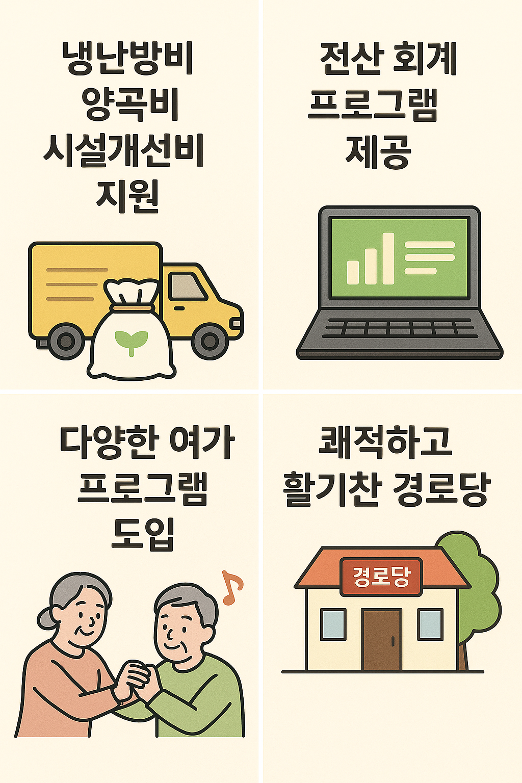 경로당의 안정적 운영을 위해 냉난방비, 양곡비, 시설개선비 지원, 전산 회계 프로그램 제공, 그리고 다양한 여가 프로그램 도입 등을 통해 어르신들이 보다 쾌적하고 활기차게 경로당을 이용할 수 있도록 지원합니다
