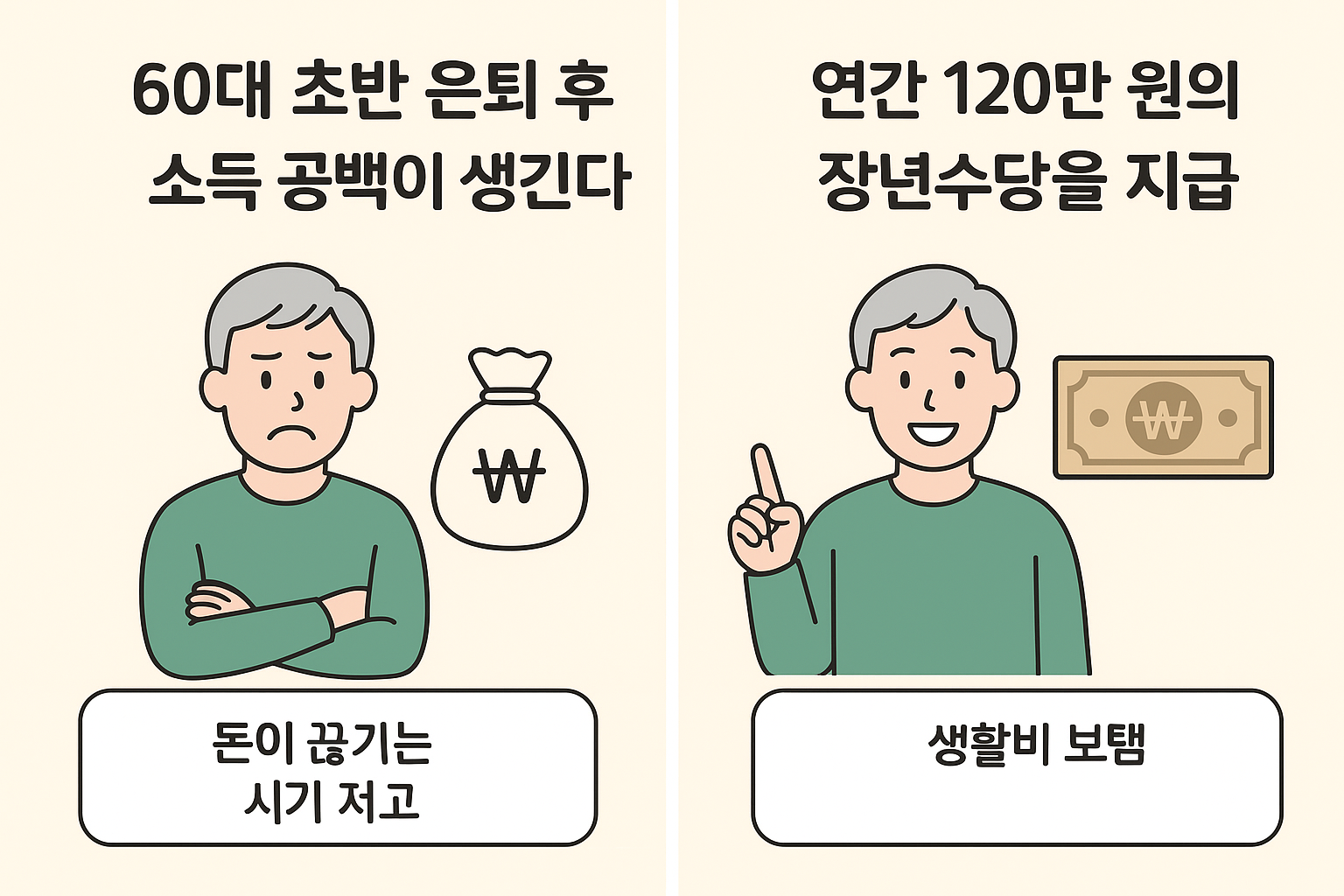 이 문제를 해결하려고, 나라에서 **매년 120만 원(한 달에 10만 원 정도)**을 주는 장년수당 제도를 만들겠다고 한 거예요.