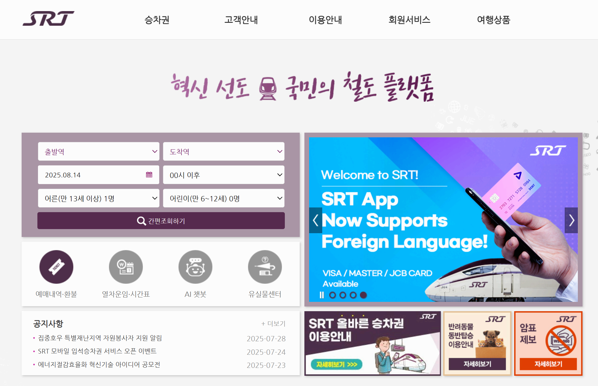 SRT기차표 구매를 위한 예매 아래 버튼에서 진행하시기 바랍니다.